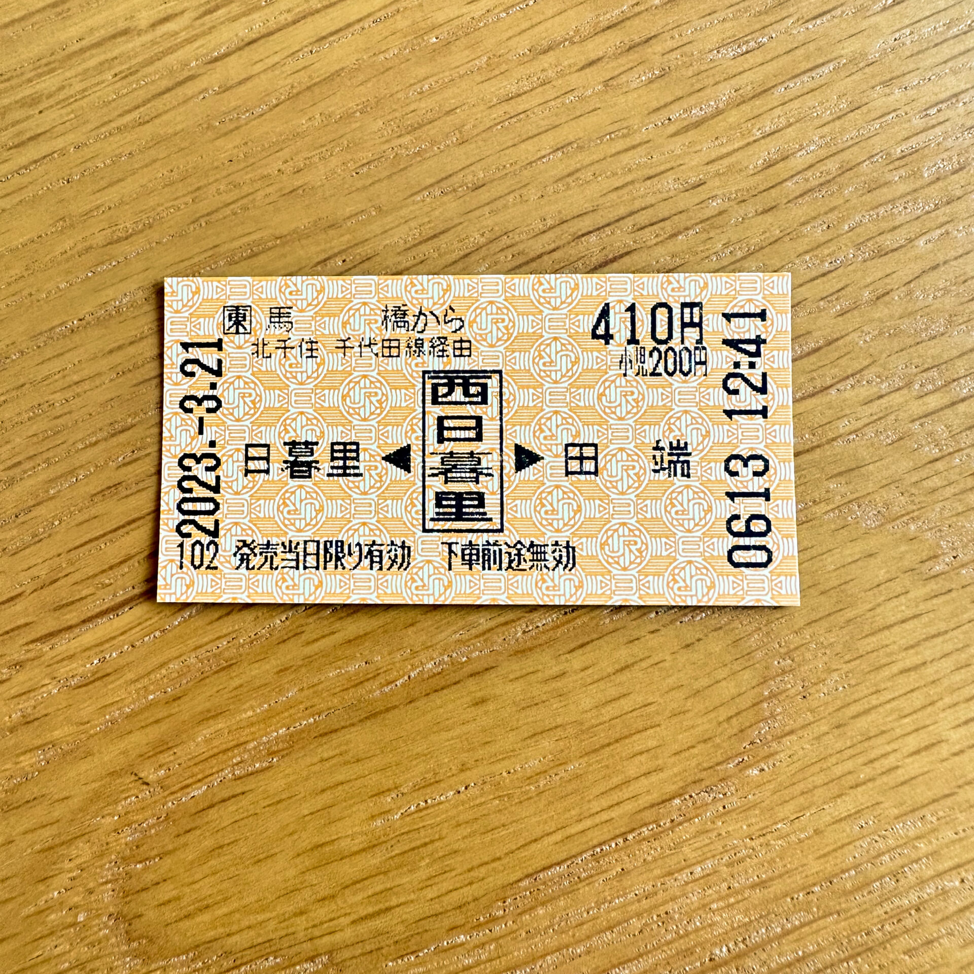 こちらは、乗換駅(接続駅)である西日暮里駅からの駅名が両矢印式で記載されたレアな券面です。