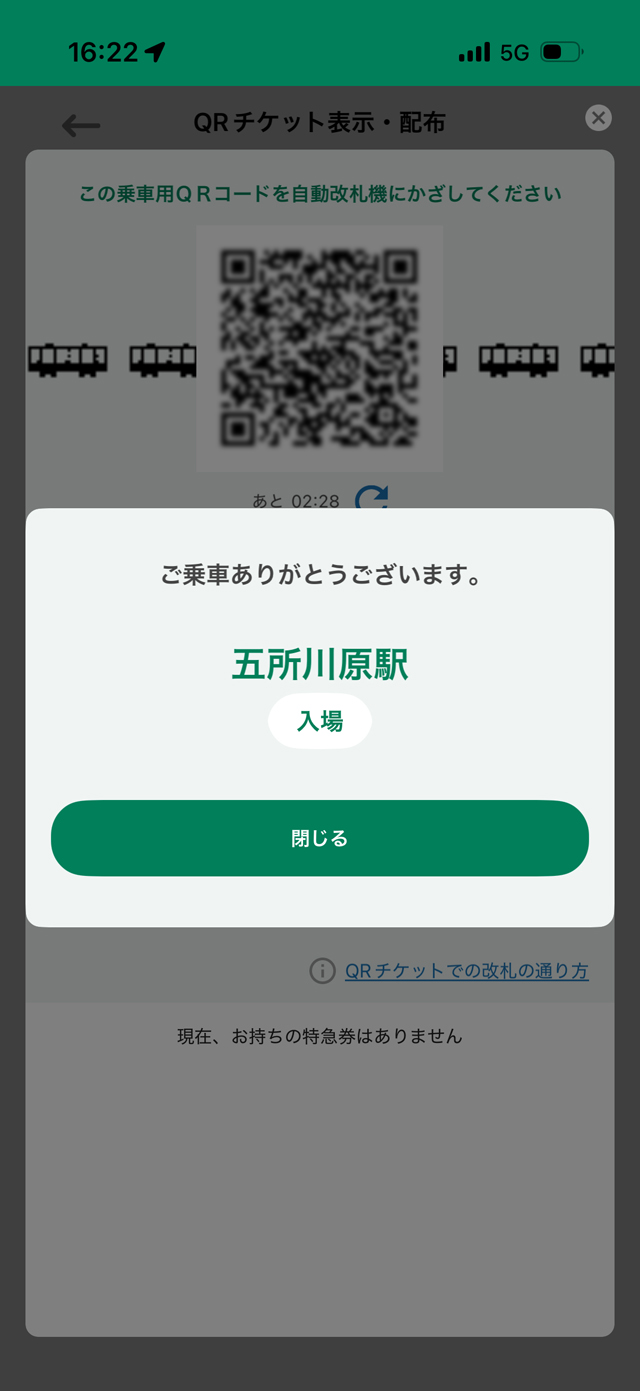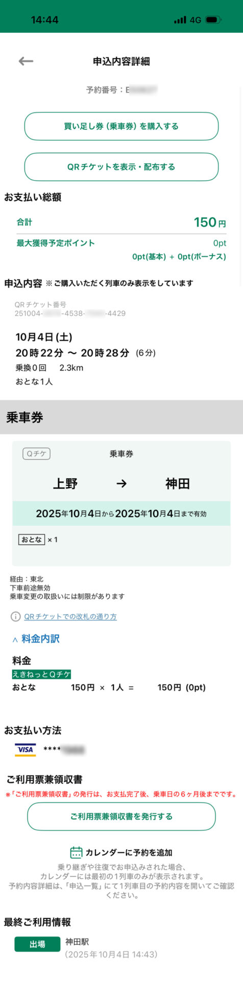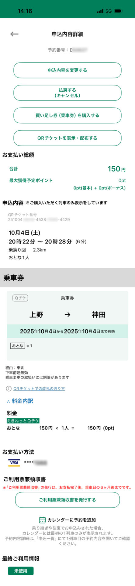 ここでは、実際に購入し、使用した「えきねっとQチケ」の実際の画面をご紹介します!