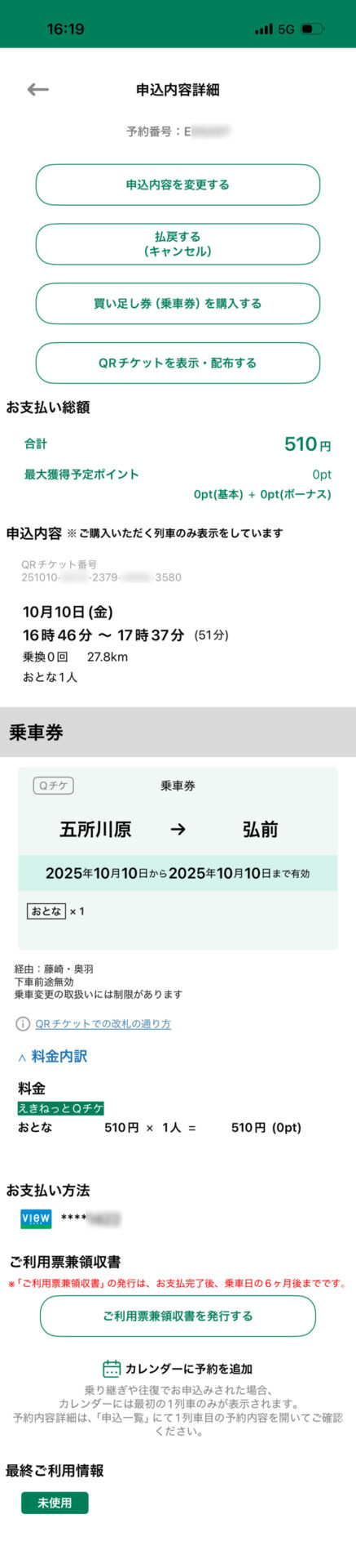 五能線五所川原駅(青森県五所川原市)から奥羽本線弘前駅(青森県弘前市)ゆきの普通乗車券を、「えきねっとQチケ」として購入しました。普通列車に乗車した際の利用方法をご説明します。
