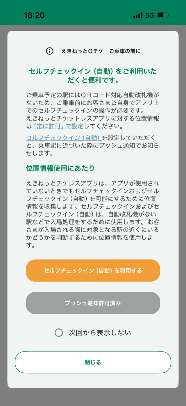 QRチケットが表示される直前に、自動チェックインを勧める画面が表示されます。あらかじめ位置情報の使用を許可しておくと、セルフチェックインの操作が格段に楽です。