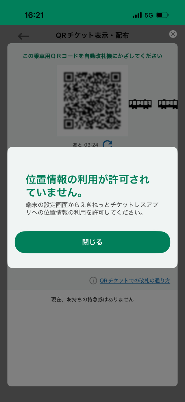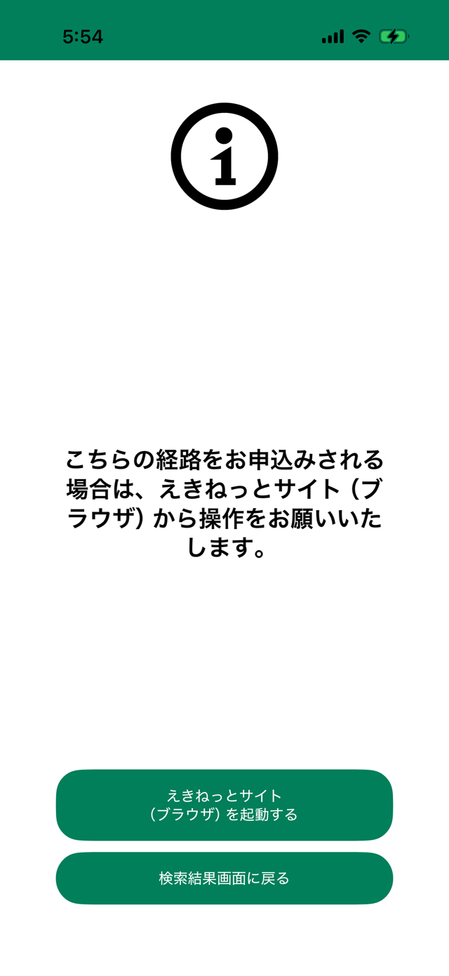 えきねっとチケットレスアプリ上で購入できない区間である場合、以下の画面が表示されます。