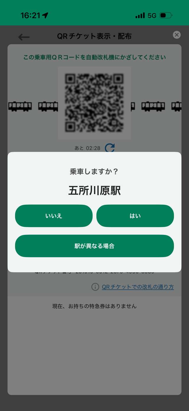 スマートフォンから取得した位置情報と乗車駅の位置が一致した場合、駅名が表示されてセルフチェックインが可能です。[はい]を押して、セルフチェックインを完了します。