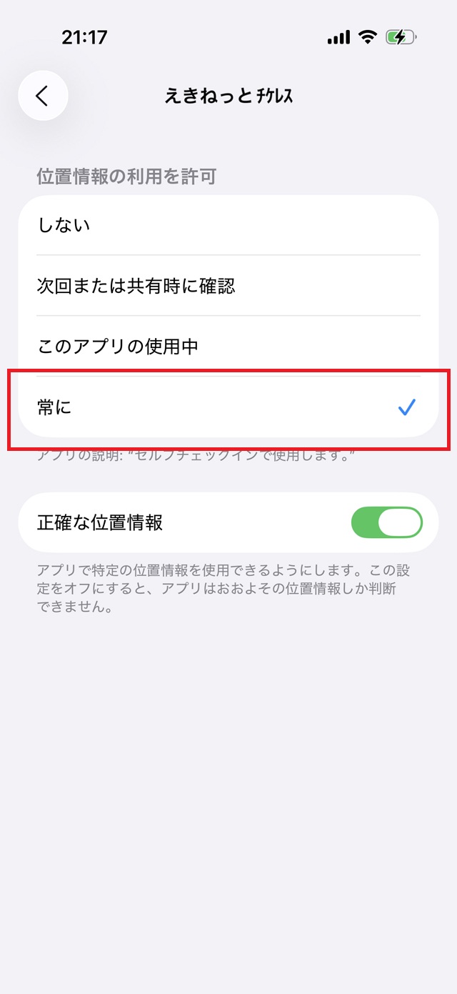 3.「えきねっとチケットレスアプリ」を探し、「常に」位置情報の利用を許可します。