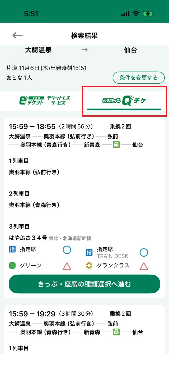この例は、大鰐温泉駅(青森県大鰐町)から仙台市内ゆきの普通乗車券に、新幹線「はやぶさ」号の特急券を付けたものです。検索結果画面で「えきねっとQチケ」タブが表示され、先に進めます。