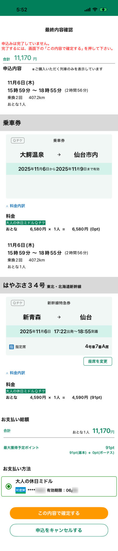 座席の設備と席番を選択した後、予約内容の確認画面に進むと、普通乗車券と新幹線特急券がセットになっていることが分かります。