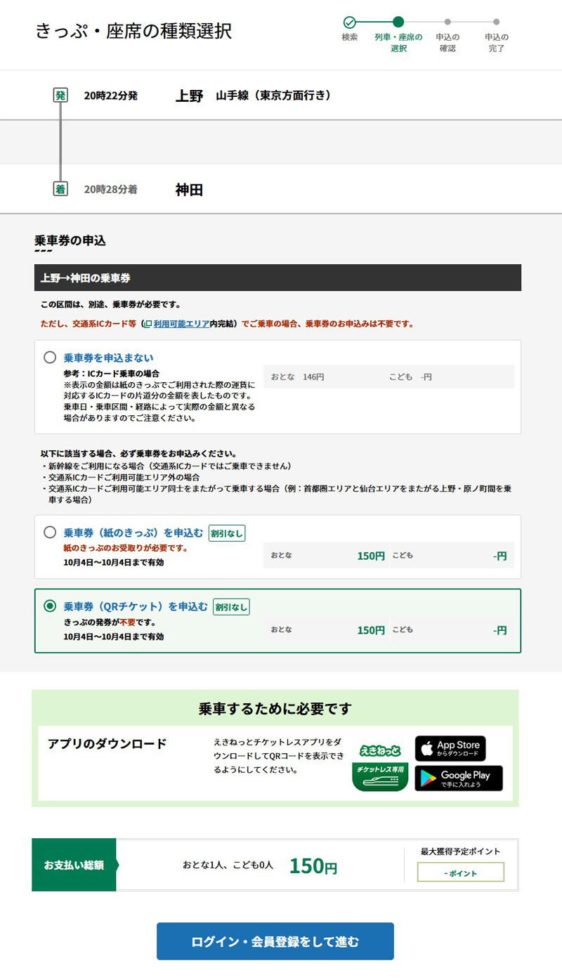 それに対し、「えきねっとQチケ」を使うには、アプリをインストールしたり設定を行ったりしなければなりません。その上、自分で購入操作を行うことは、いかに手間がかかることでしょうか。オンラインで決済を行うため、現金での決済はできません。