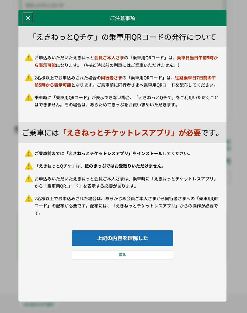 代金を決済する際、「えきねっとQチケ」特有の注意事項が表示されるので、よく確認しましょう。紙のきっぷを駅で受け取る必要はないし、紙のきっぷを発券すること自体できません。