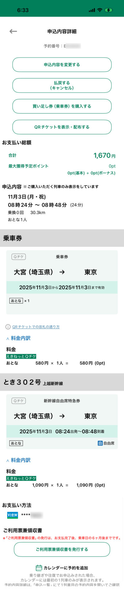 大宮駅(さいたま市大宮区)から東京駅(東京都千代田区)まで新幹線に乗車する際のきっぷを、乗車券と特急券がセットになった「えきねっとQチケ」として購入しました。
