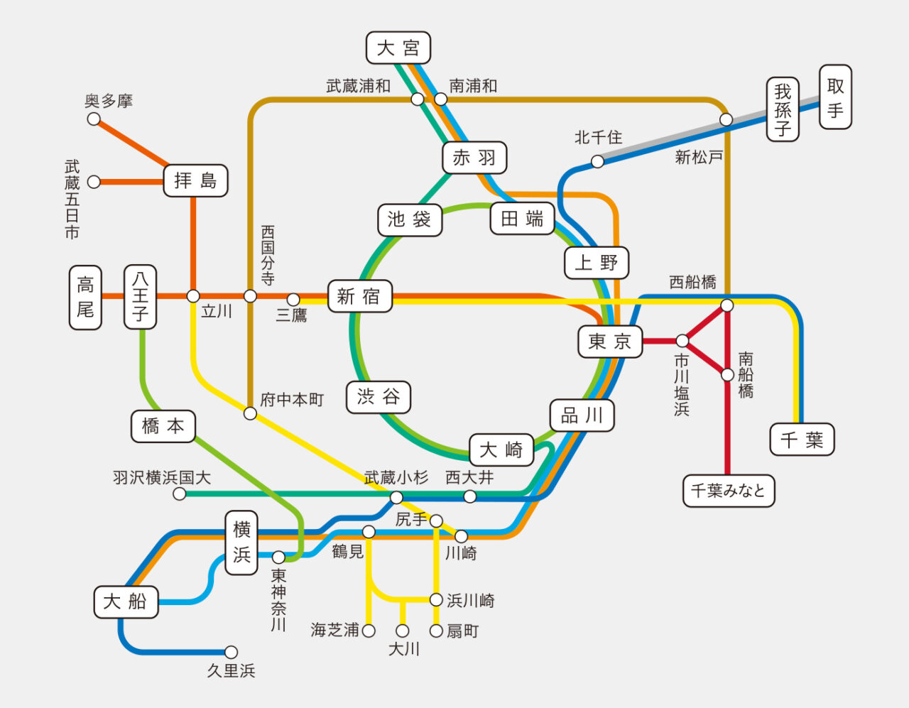 この図のように、東京附近における電車特定区間には東京都区内の各駅はもちろん、横浜駅・八王子駅・大宮駅・千葉駅といった東京近郊の主要駅も含まれています。