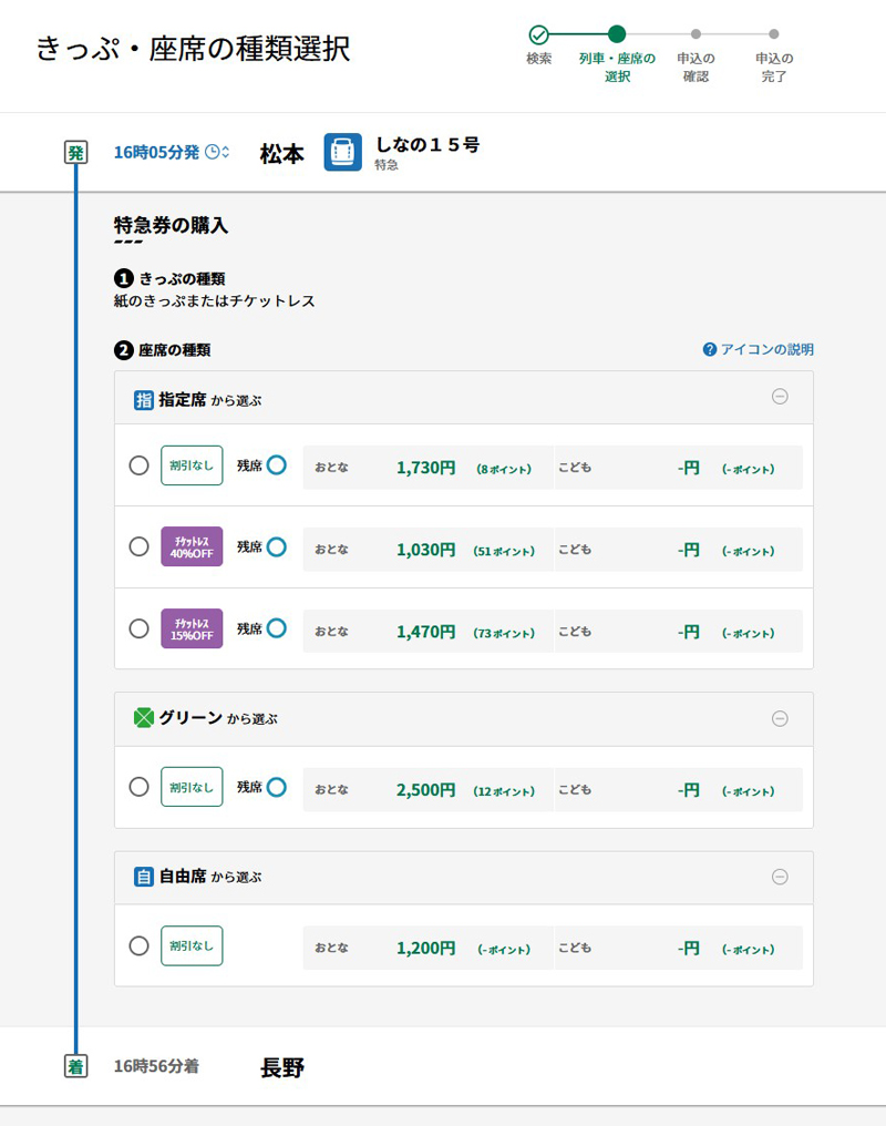 このように、ウェブブラウザ上で予約操作を行うと、普通車自由席やグリーン車も選択できるようになります。チケットレス40%OFFと表示されているのは、期間限定の在来線チケットレス特急券(トク割)です。