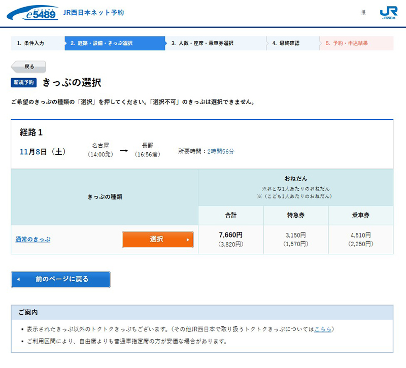 このように、割引なしの通常のきっぷ以外の選択肢は表示されません。JR東日本区間で利用可能な在来線チケットレス特急券も「e5489」では購入できないので、注意しましょう。
