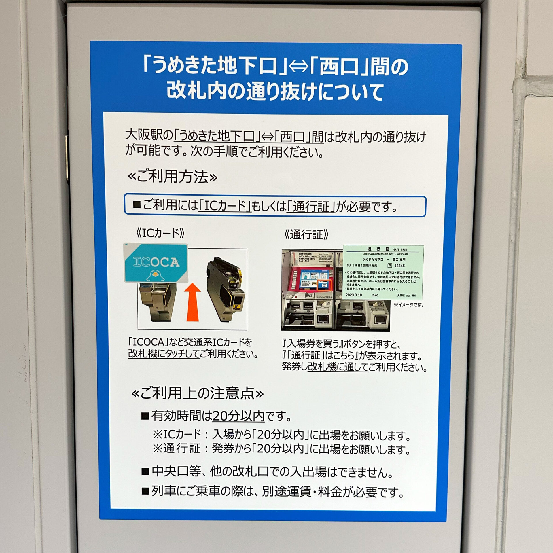 駅のラッチ内(改札口の内側)に入場するには、通常入場券を買う必要があります。しかし、大阪駅のうめきたエリアへのアクセスには難があることから、西口とうめきた地下口の間を行き来する場合に限って、無料で通行できる特例があります。