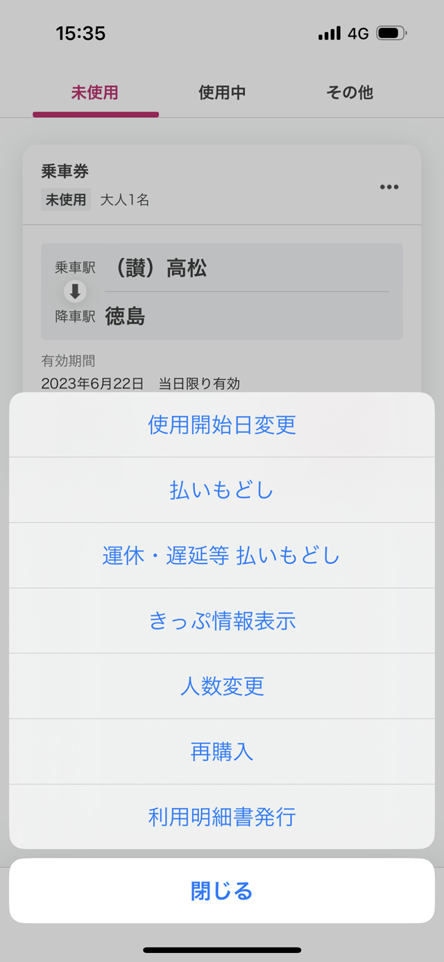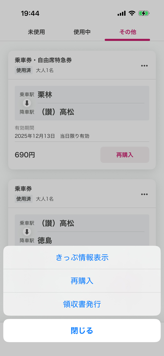 履歴画面およびきっぷの管理画面から、同じ区間のきっぷを再購入できます。きっぷが未使用であれば、使用日の変更や払いもどし、利用証明書の発行が可能です。