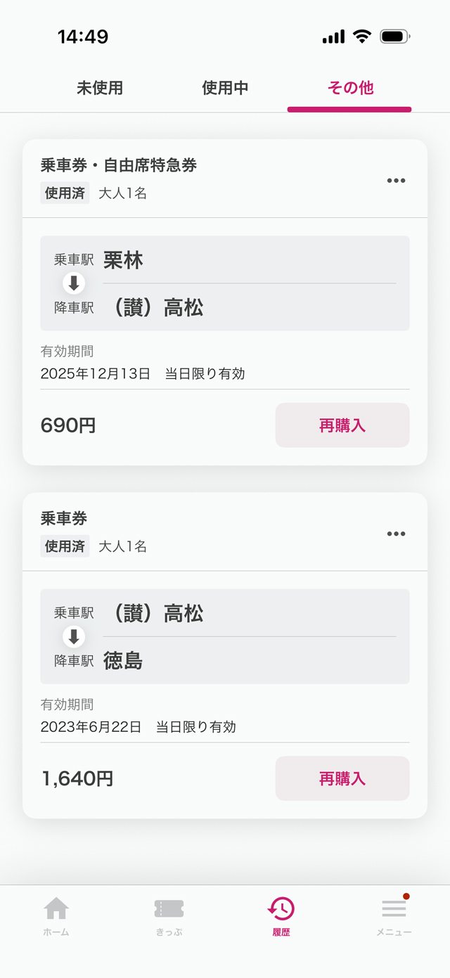 履歴画面には、このような[再購入]ボタンが表示されており、一度利用した区間のきっぷを簡単に購入できます。