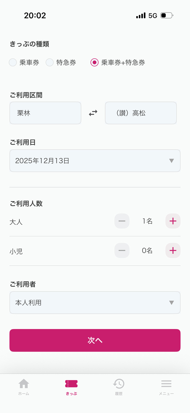 初期画面では、乗車区間・日にち・人数および利用者(本人か代理購入か)を入力するだけです。