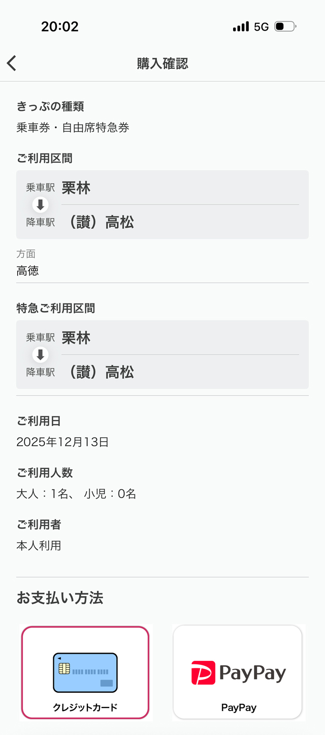 その後、経路や特急利用区間を選択すれば、即座に決済画面にたどり着きます。空席情報や不要な選択肢が表示されないため、迷うことがありません。