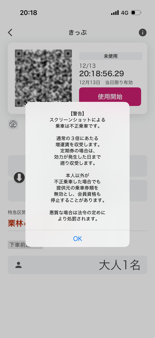 JR四国側にとってのセキュリティも万全です。一例として、スクリーンショットを保存しようとすると、警告がポップアップ表示されます。使用中のきっぷは動的な表示であり、スクリーンショットによる乗車を抑止できるように設計されています。