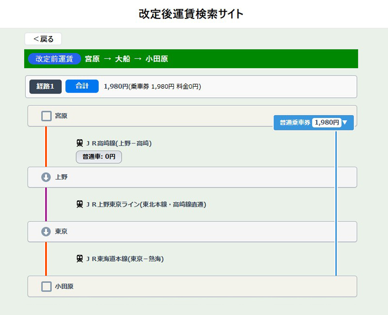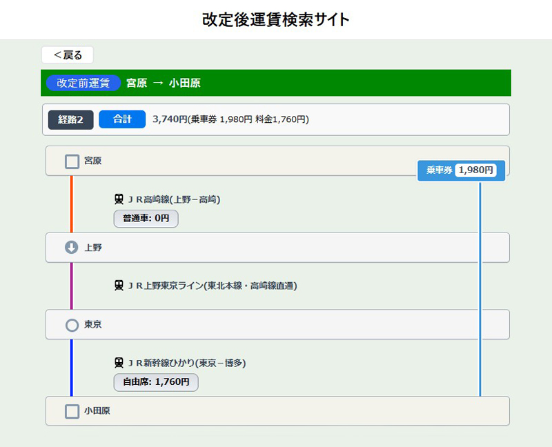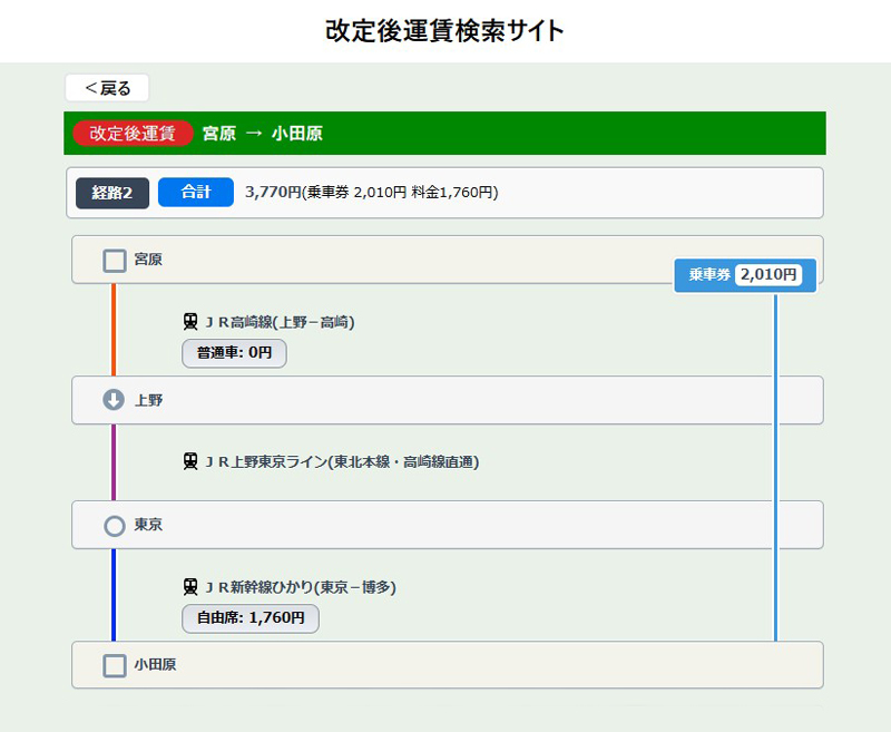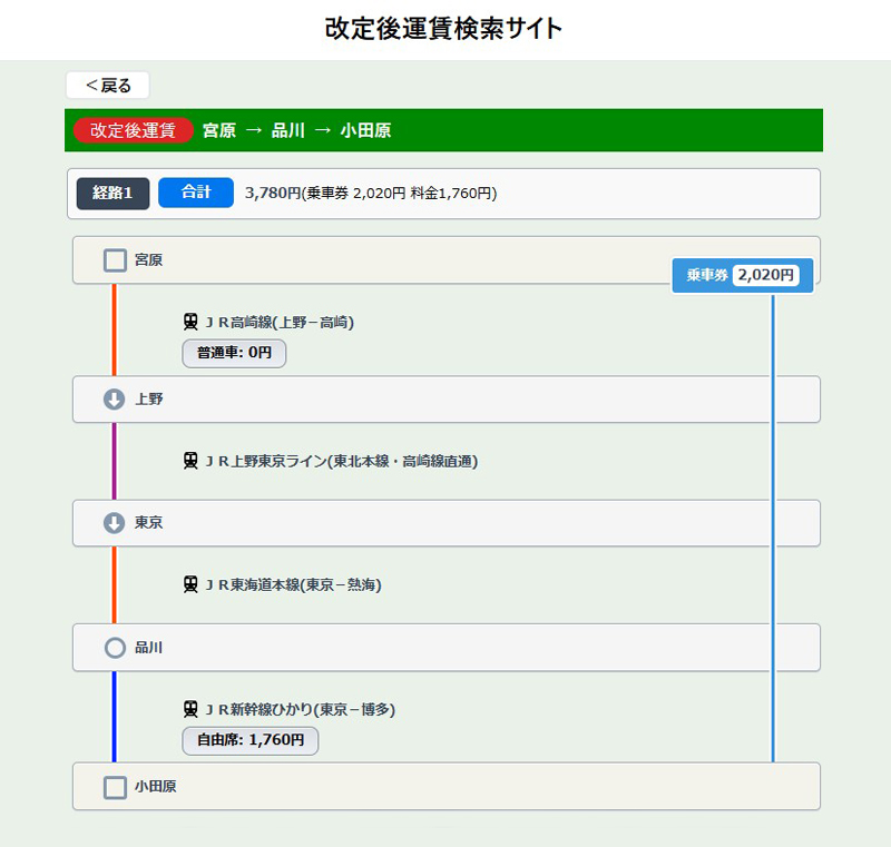 宮原駅・小田原駅間の運賃計算【運賃改定後】